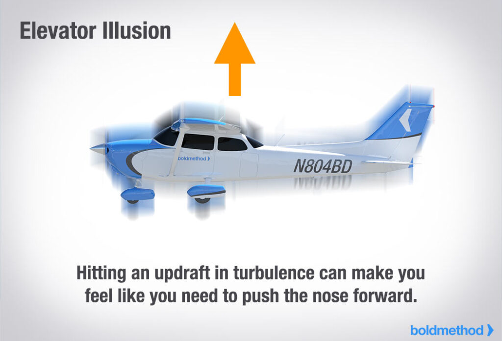 雲の中、特に夏場の飛行で難しいのは、たいてい乱気流もあることです。上昇気流に乗ると、飛行機が急に垂直方向に加速されるエレベーター錯視が起こります。機体は水平飛行をしているはずなのに、機首を前に押し出すように感じ、急降下姿勢になります。