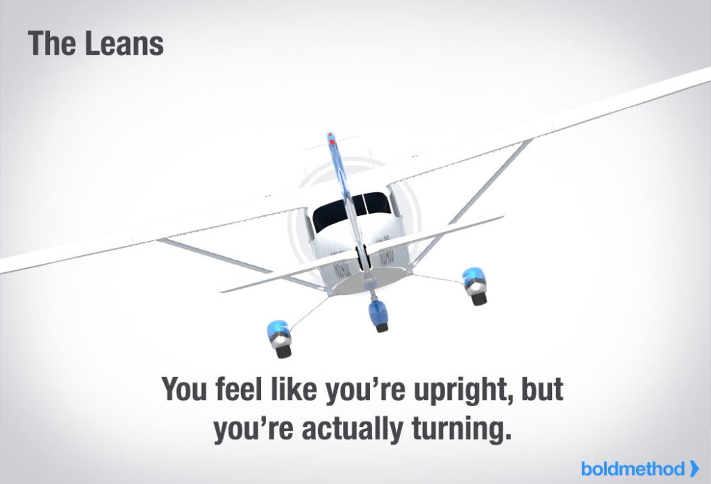 リーンは、バンクターンの進入が遅すぎる場合に起こります。例えば、左旋回に入るときに十分な速さでロールしないと、耳の中の液体が動き出さず、脳はまだまっすぐ水平にいると勘違いしてしまいます。また、急に翼を水平飛行に戻すと、耳と脳は反対方向(右方向)にバンクしていると勘違いしてしまいます。そのため、飛行機を左に倒したり、体をそちらに傾けたりしないと「直立」にならないように感じてしまうのです。もし、雲の上で教官に押し付けられるようなことがあれば、バンクしている可能性があります。