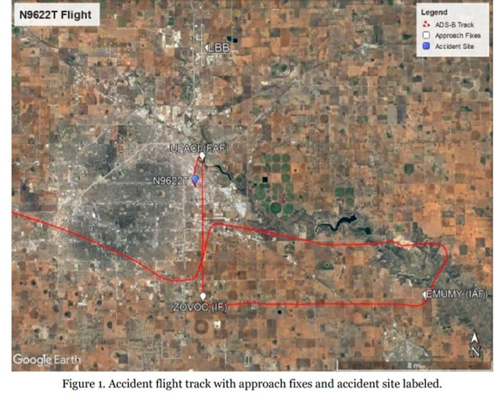 航空管制の記録とADS-Bデータを確認したところ, 飛行機はLBBに向かう降下中に計器気象条件(IMC)にあったことが判明し, パイロットは「かなり長い間」IMCにいたと報告している. パイロットは滑走路35LへのRNAV (GPS) Y計器進入のためのセットアップを指示された. パイロットは滑走路35LへのRNAV(GPS) Y計器進入を指示されたが、進入中に計器進入がわからなくなり、最終進入コースをインターセプトできる位置にいなかったため、管制官はパイロットを東に誘導し、別の初期進入修正点(IAF)で同じアプローチにセットアップさせるよう指示した。