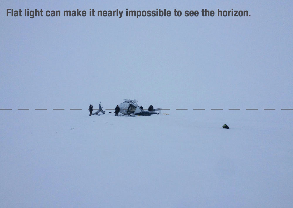 ホワイトアウトでは視覚的な基準がないので、雲の中を飛行しているのと同じです。ホワイトアウトは積雪地帯での航空事故の原因となっています。特にヘリコプターのパイロットは、積雪地からの離陸時にローターウォッシュによってヘリコプターが雪の渦に包まれ、影響を受けやすいのです。