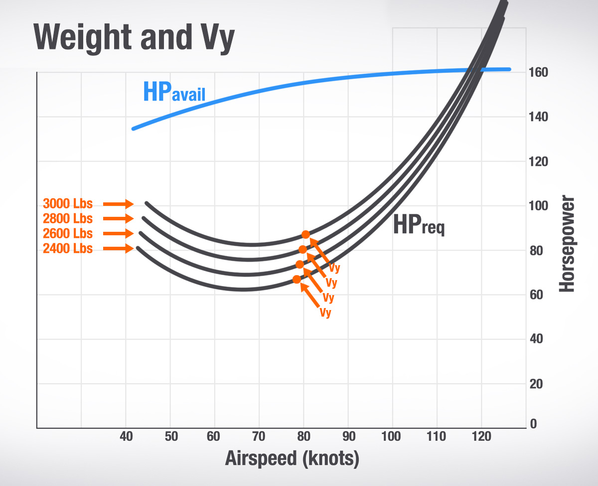 飛行機が重くなればなるほど、本当にVyを達成するためにはより速く飛ぶ必要があります。しかし、あなたのPOHは最大総重量のVyを公表していることが多いので、覚えておいて下さい。ですから、最大重量を下回っている場合、重量調整されたVy速度を達成するためには、公表されているVyより遅く飛ぶ必要があります。