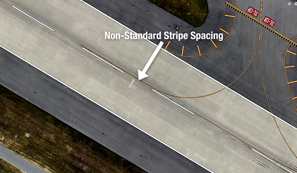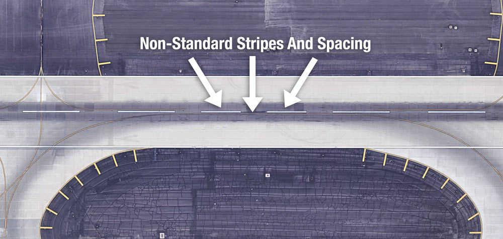 このルールの1つの大きな例外は明らかです。すべての滑走路が完璧なストライプの長さを持っているわけではないのです。FAAによると、”滑走路の長さに対応するために必要なストライプとギャップの長さの調整は、滑走路の中間点付近で行われる。”とあります。下記は2つの例で、中心線のストライプとギャップが滑走路の中間点に向かってどのように調整されるかを示しています。