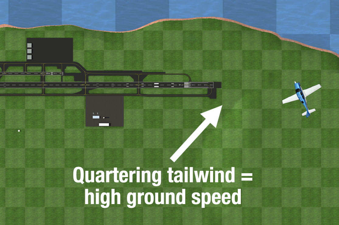 Overshooting Finalはいくつかの理由で起こりますが、その第一は風です。下図のような横風が吹くと、ベースレグでの対地速度が高くなります。そして、対地速度が高くなればなるほど、センターライン上に完璧にロールアウトするために、より多くのバンクが必要になります。
