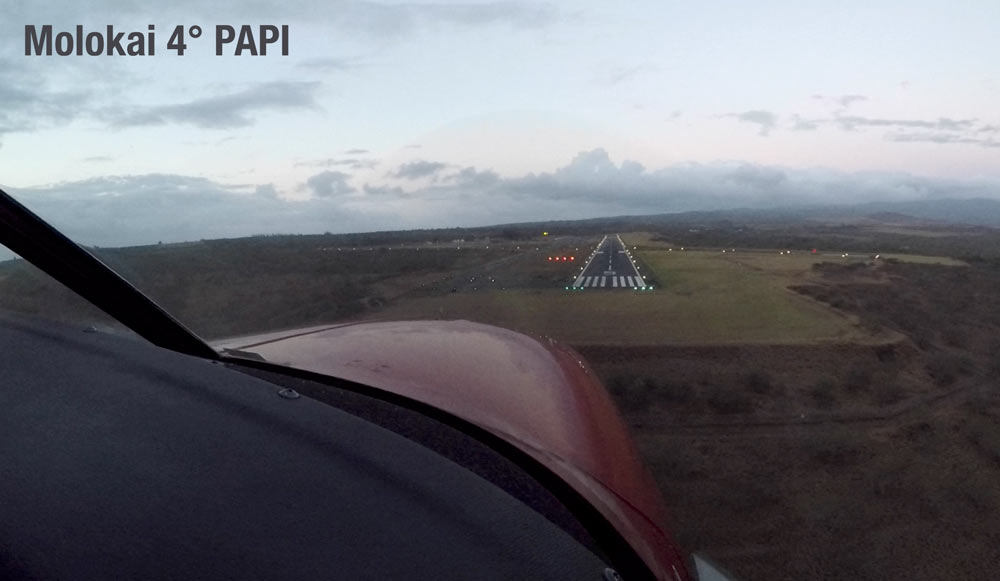モロカイ空港(PHMK)の4灯PAPIは、地形が急激に隆起しているため、着陸閾値から1.8NM以遠の参照は禁止されている。モロカイ空港のPAPIは4度のグライドパスにあり、ストレートインアプローチの基準として設置されている。