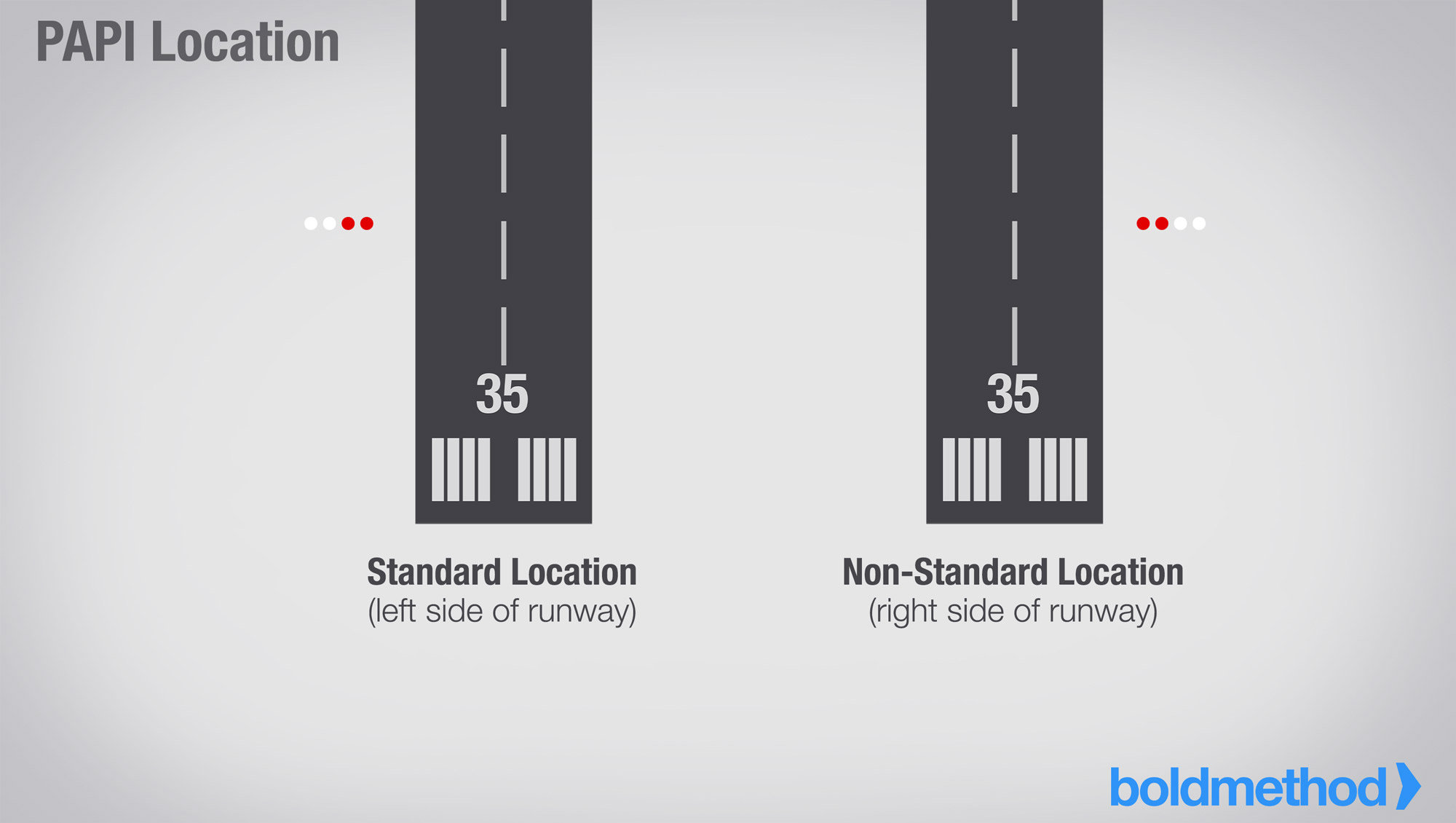 ほとんどの場合、PAPIライトは滑走路の左側にあります。標準以外の場所は滑走路の右側にあります。