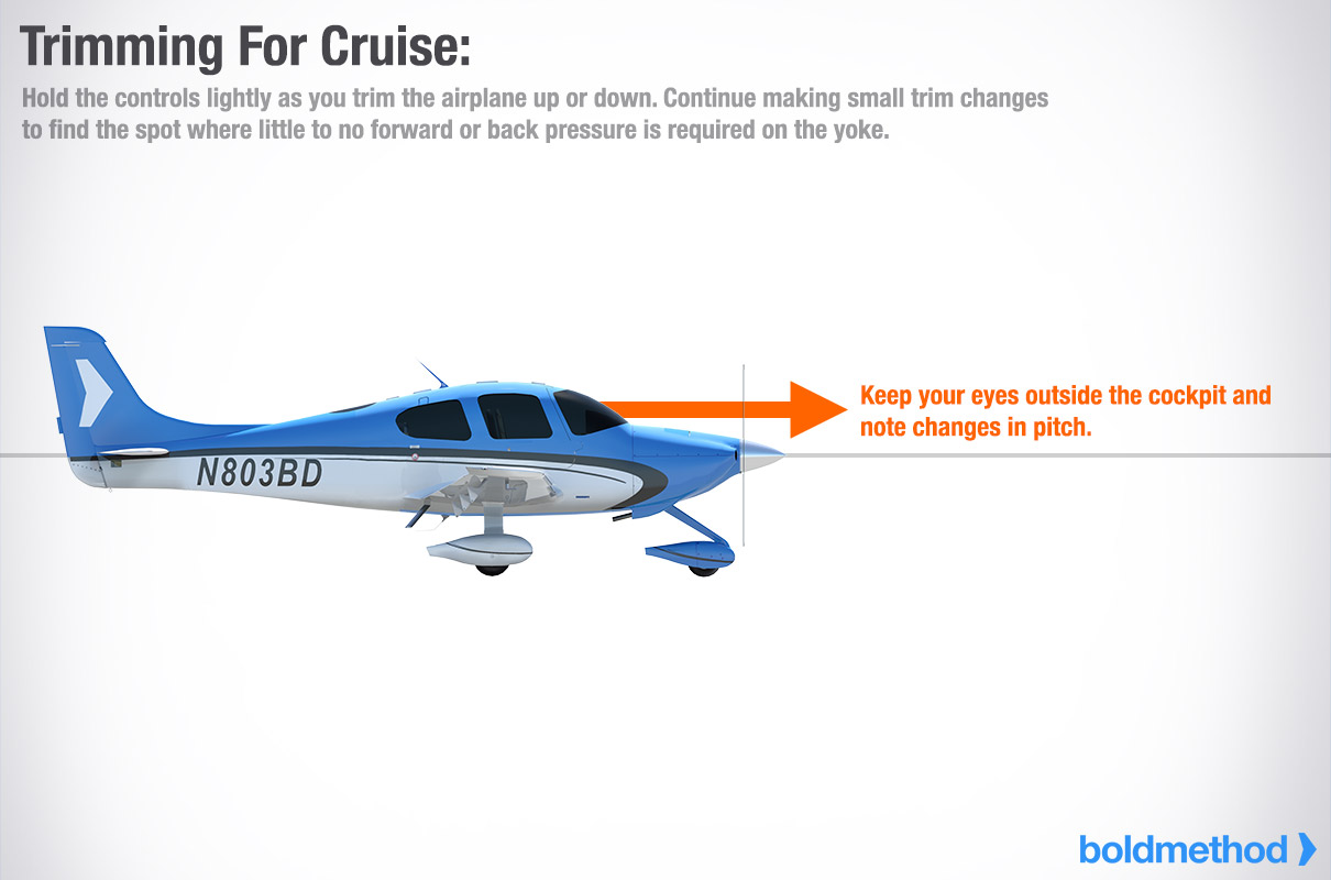 機体を上下させるときは、操縦桿を軽く握ってください。コックピットの外から目を離さず、ピッチの変化に注意してください。小さなトリム変更を続けながら、ヨークを握る手が前方にも後方にもほとんど力を必要としない場所を見つけます。完璧にトリムできたら、ヨークから手を離しても、ピッチアップもピッチダウンもせずに飛び続けることができるはずです。