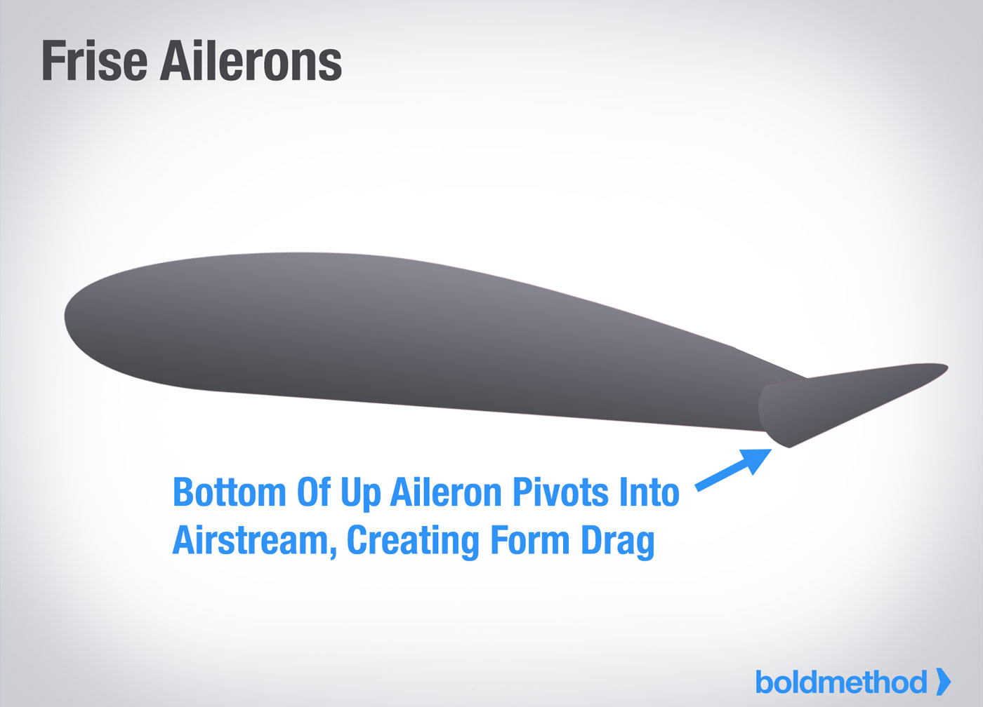 2) フライズ・エルロン: エルロンがオフセットヒンジで回転する。エルロンの前縁が気流に押し込まれ、抗力が発生し、不利なヨーが減少する。この場合、フライズエルロンは誘導抗力に対抗するために形状抗力を利用している。