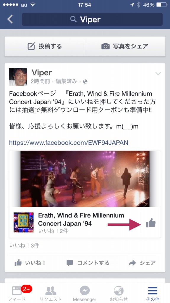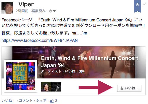 高音質ハイレゾの音源・無料ダウンロード用クーポン応募の 『いいね』 のボタンは矢印の位置にあります