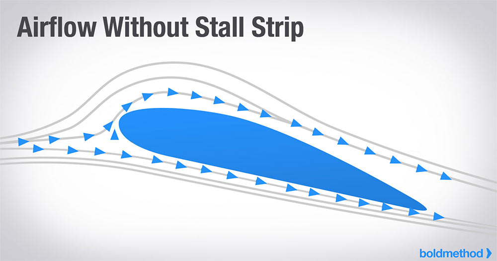 ストールストリップは翼の迎え角が高くなったときに機能し始めます。よどみ点が翼の下側にあるため、空気は前縁の周りを流れ、翼の上面を通過します。ストールストリップがない場合、気流は翼に付着したままとなります。