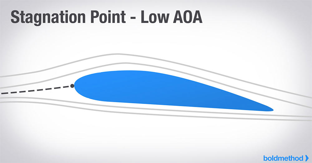 翼の迎え角(AOA)が低い場合、よどみ点は前縁にあり、翼の迎え角が高い場合、よどみ点は前縁の下に移動します。