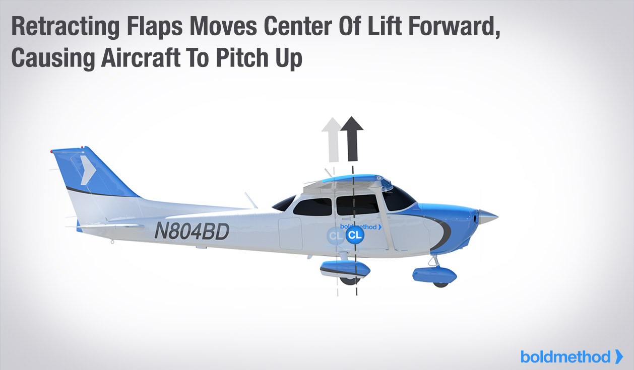 問題はフラップの格納だ。フラップが格納されると、翼の揚力中心が前方に移動し、多くの機体が自然にピッチアップする(これは設計に依存するもので、すべての機体がピッチアップするわけではない)。