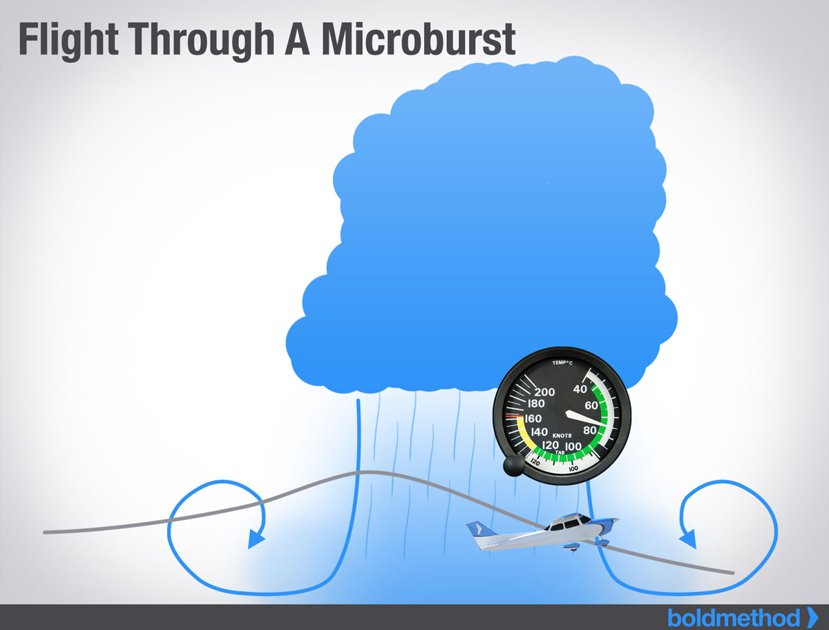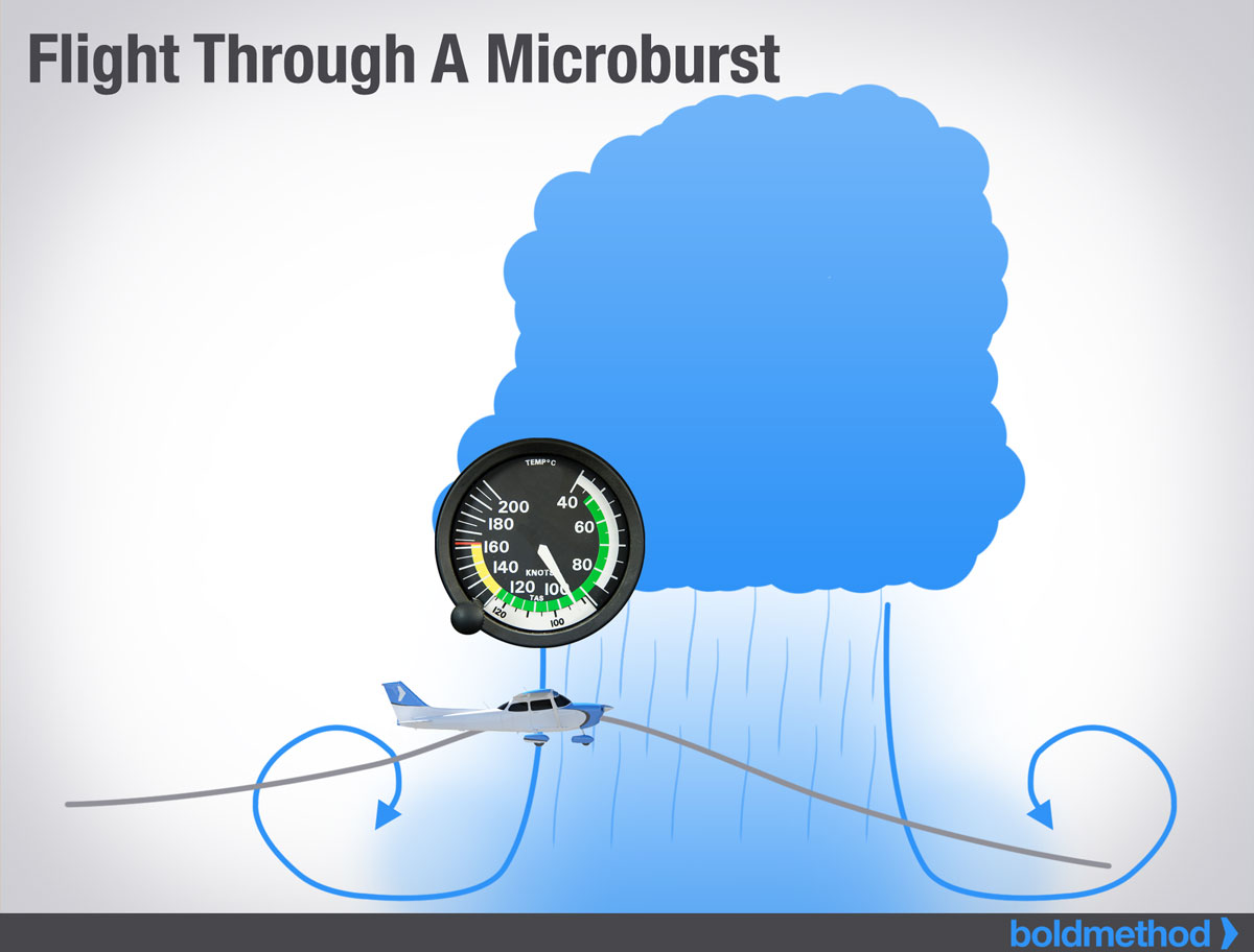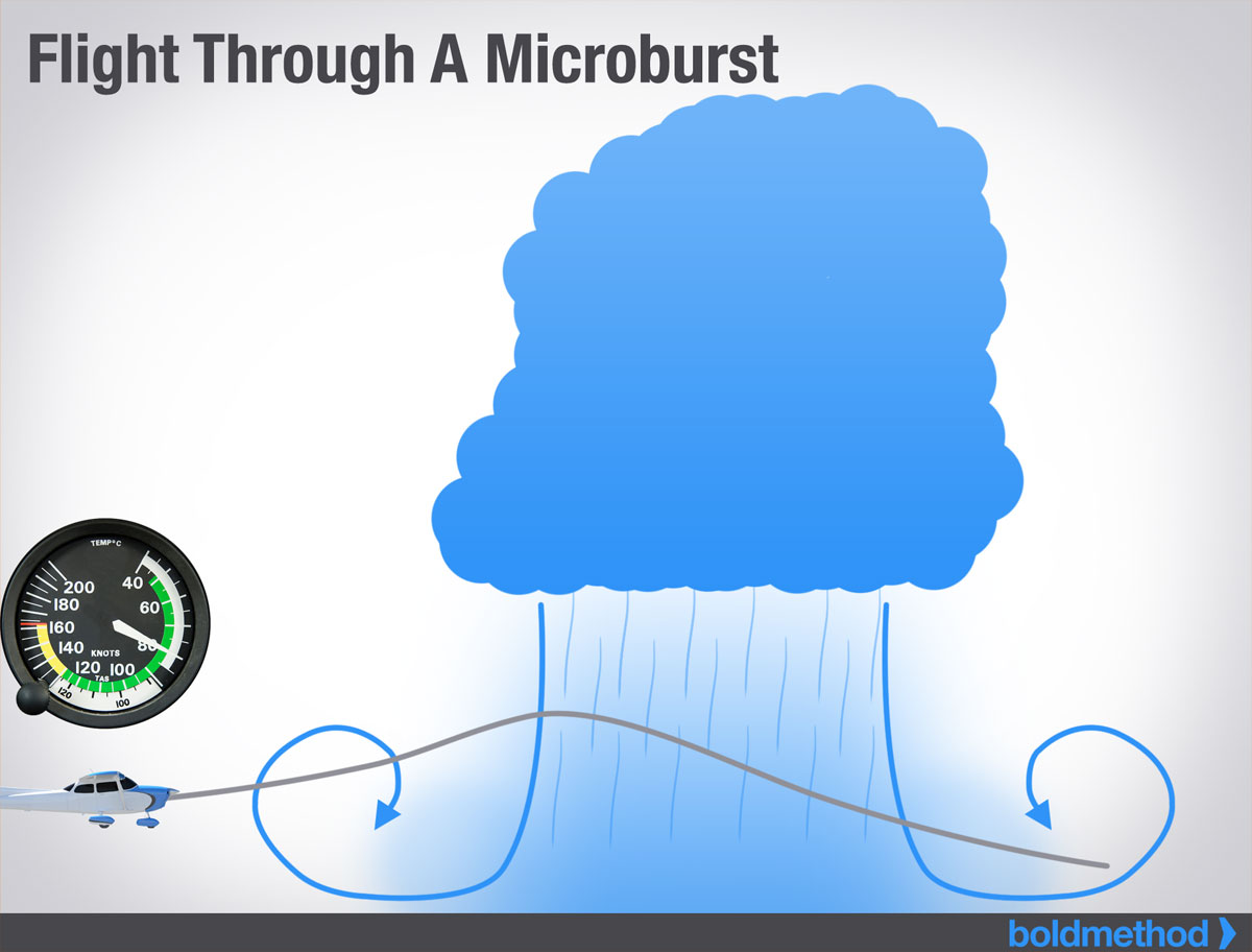 マイクロバーストの下降気流はそれだけでも危険だが、ウィンドシアが状況を著しく悪化させる。アウトフローのピーク突風速度が25ノットだとすると、マイクロバーストを通過する際に50ノットのシアを経験することになる。つまり、対気速度は25ノット付近で上昇し、抜ける前に50ノットまで一気に低下する。