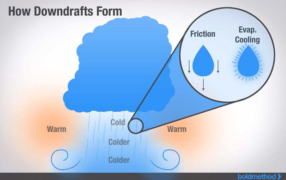 雨と空気の柱は周囲の大気より冷たくなっている。冷たい空気は暖かい空気よりも密度が高いため、重さが増して下降し始める。雨と空気が降下するにつれ、雨は蒸発し続け、空気はさらに冷やされる。降下速度が速まり、マイクロバーストが発生する。