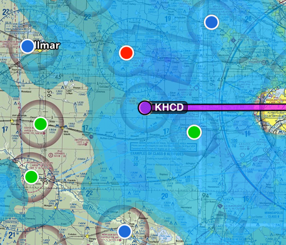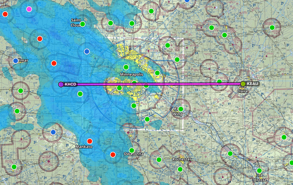 ミネアポリス周辺は以前飛行したことがありますが、ハッチンソン(KHCD)には行ったことがありません。ルート上に地形的な障害物はなく、大部分のルートではVFRの天井高度(雲底高度)が報告されています。雪の帯は地域をゆっくりと東に移動しており、1日を通して状況が大きく変わることはなさそうです。