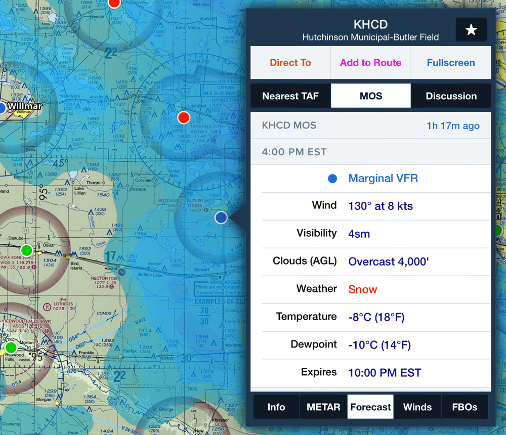 ハッチンソン空港(KHCD)にはTAF(端末空港予報)がありません。最も近いTAFは35マイル以上離れたKRWF(レッドウッドフォールズ空港)で発行されています。しかし、ForeFlightではKHCDの「MOS予報(Model Output Statistics)」が利用可能です。