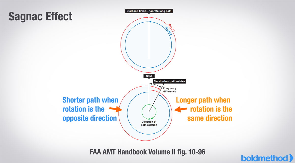 サニャック効果 とは、回転する物体の周囲を光が進むとき、光が物体の回転方向と同じ向きに進む場合は移動時間が長くなり、反対向きに進む場合は移動時間が短くなるという原理である。