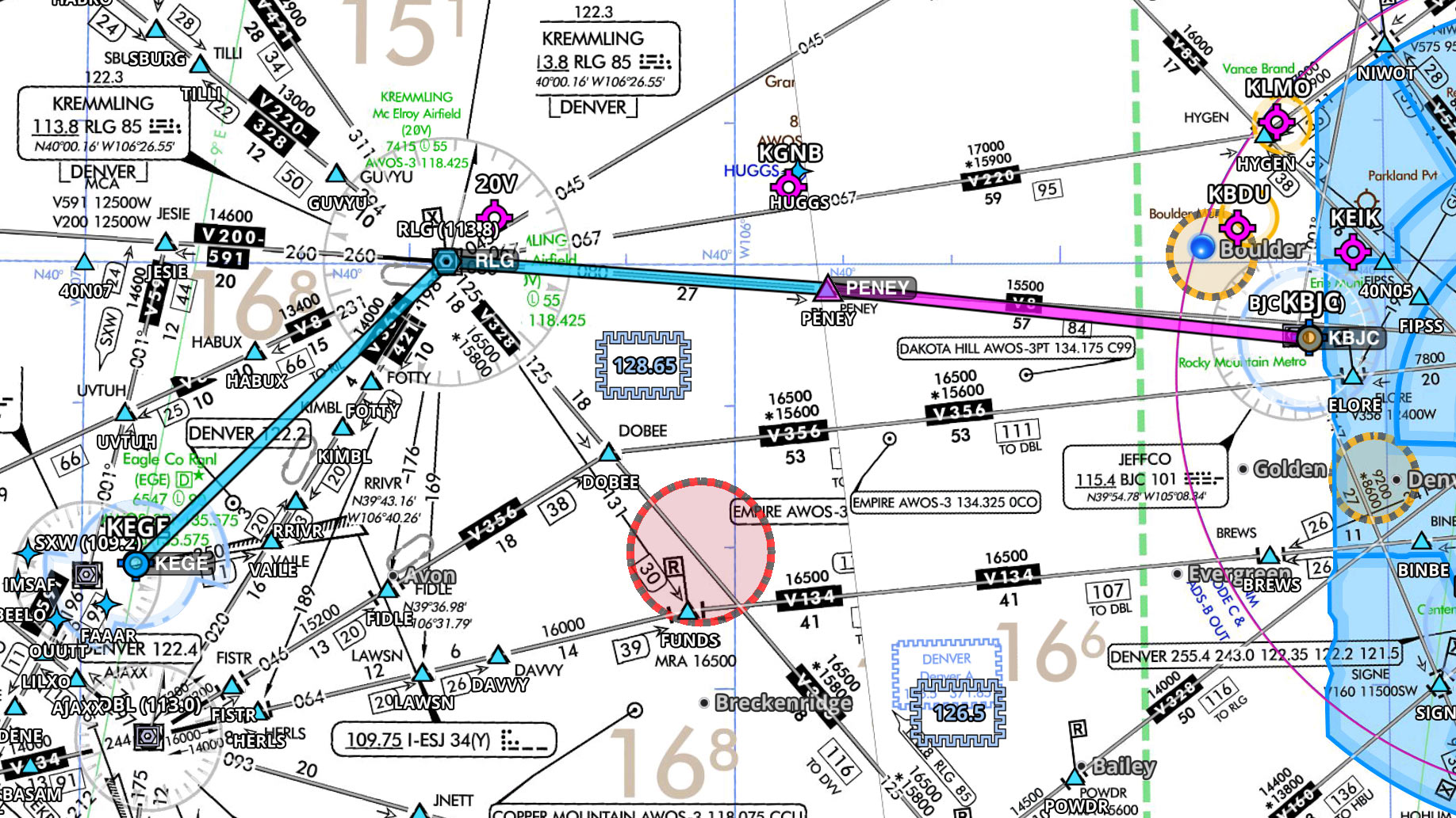 あなたのフライトのクリアランスは “デンバー2出発、V8、RLG、KEGE直行便でイーグル郡(KEGE)に向かうことを許可します。上昇し8,000を維持し、出発10分後にFL200になる予定です。出発周波数126.1. スコーク 0307”