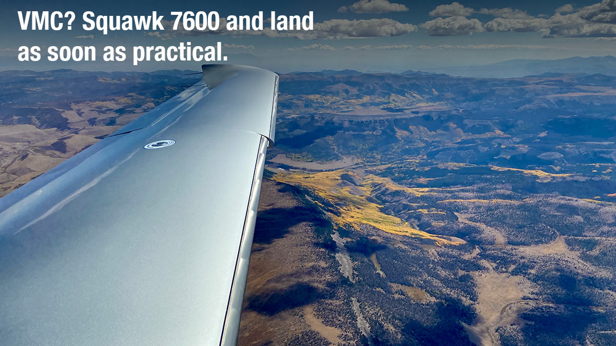 18,000feet以下なら7600をスコークしてスタートし、VFR巡航に問題ない高度まで降下または上昇します。その後、VFR巡航が可能な高度まで降下または上昇します。