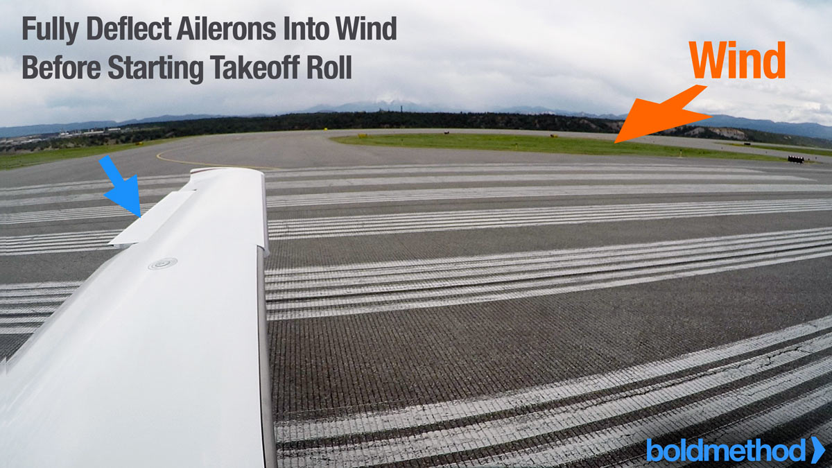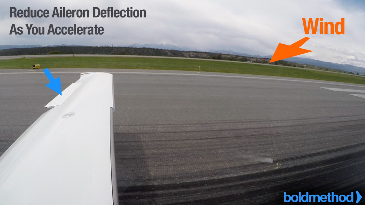 テイクオフロールを開始するときに、エルロンをフルに風に向けてください。エルロンが効いてくると、操縦輪にかかる圧力が増すのを感じるでしょう。加速するにつれてエルロンの入力をゆっくりと減らしていきますが、翼を水平に保つのに十分なたわみを保ちます。