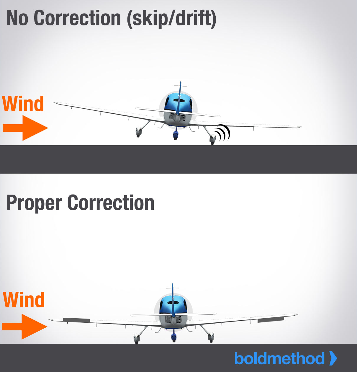 「風上側の主翼を上昇させると、横風にさらされる主翼表面積が大きくなり、飛行機がスキップすることがある」(FAA AFH 5-7)。